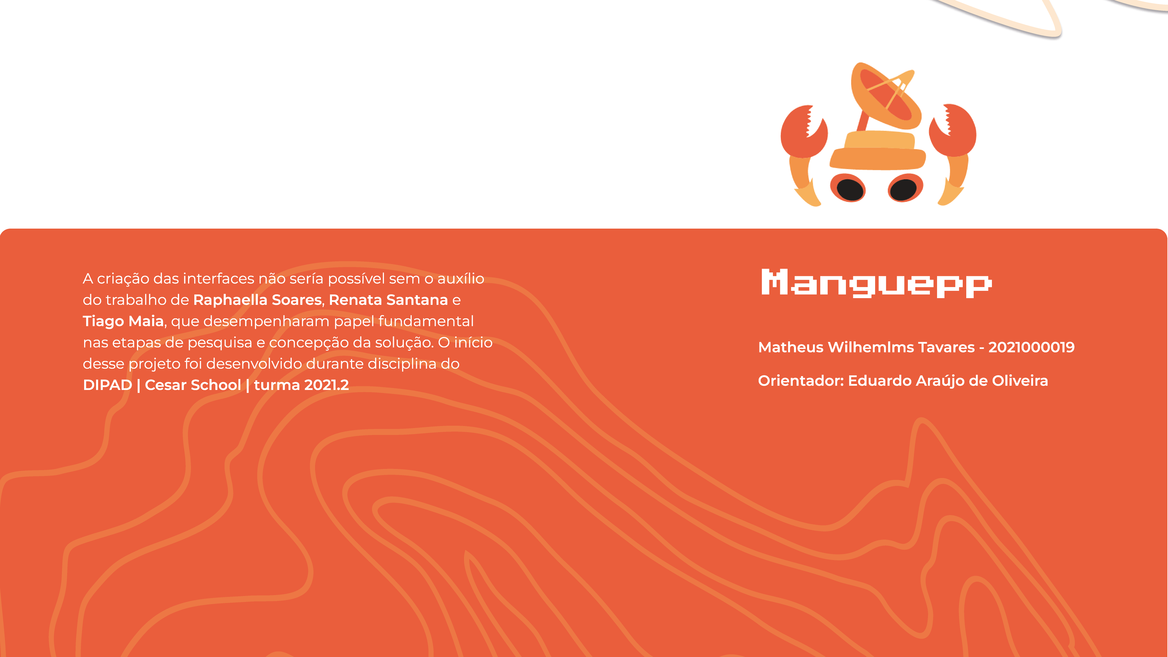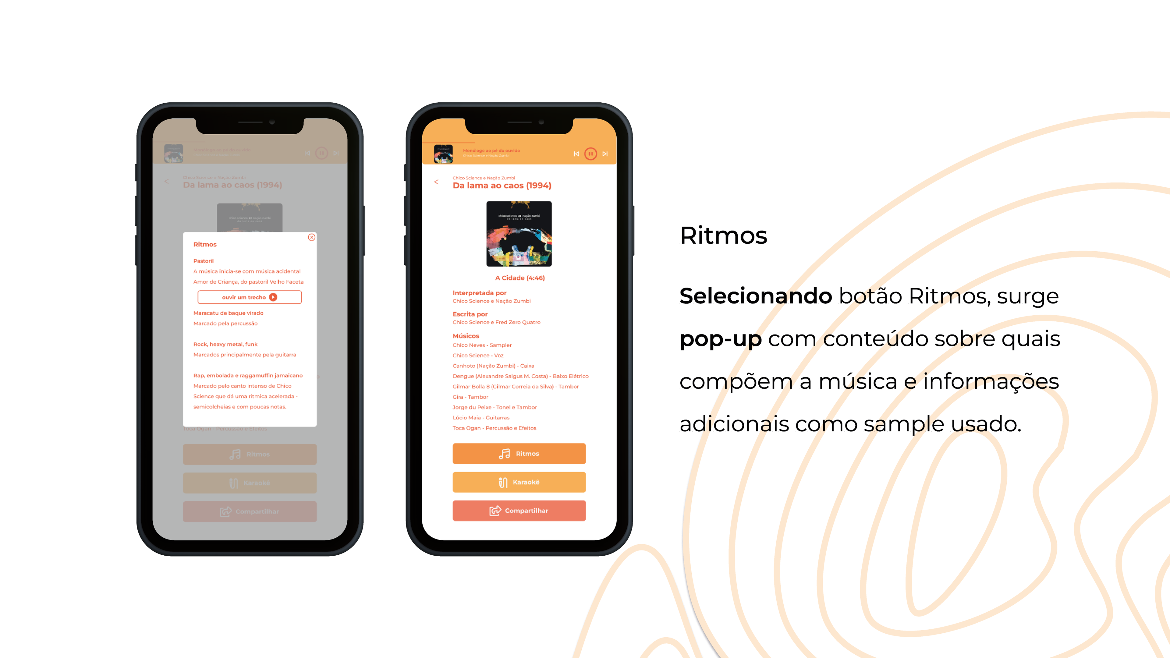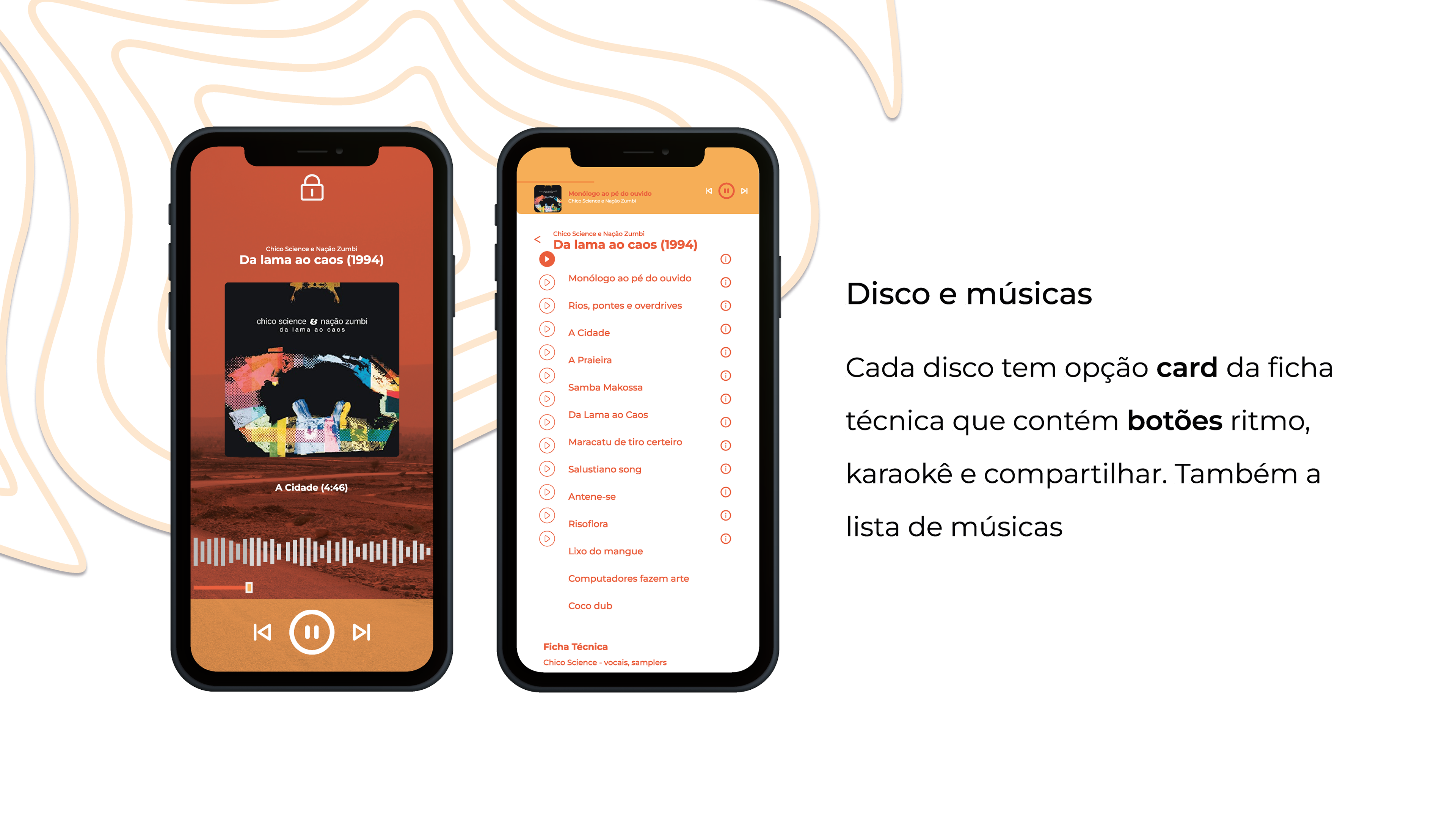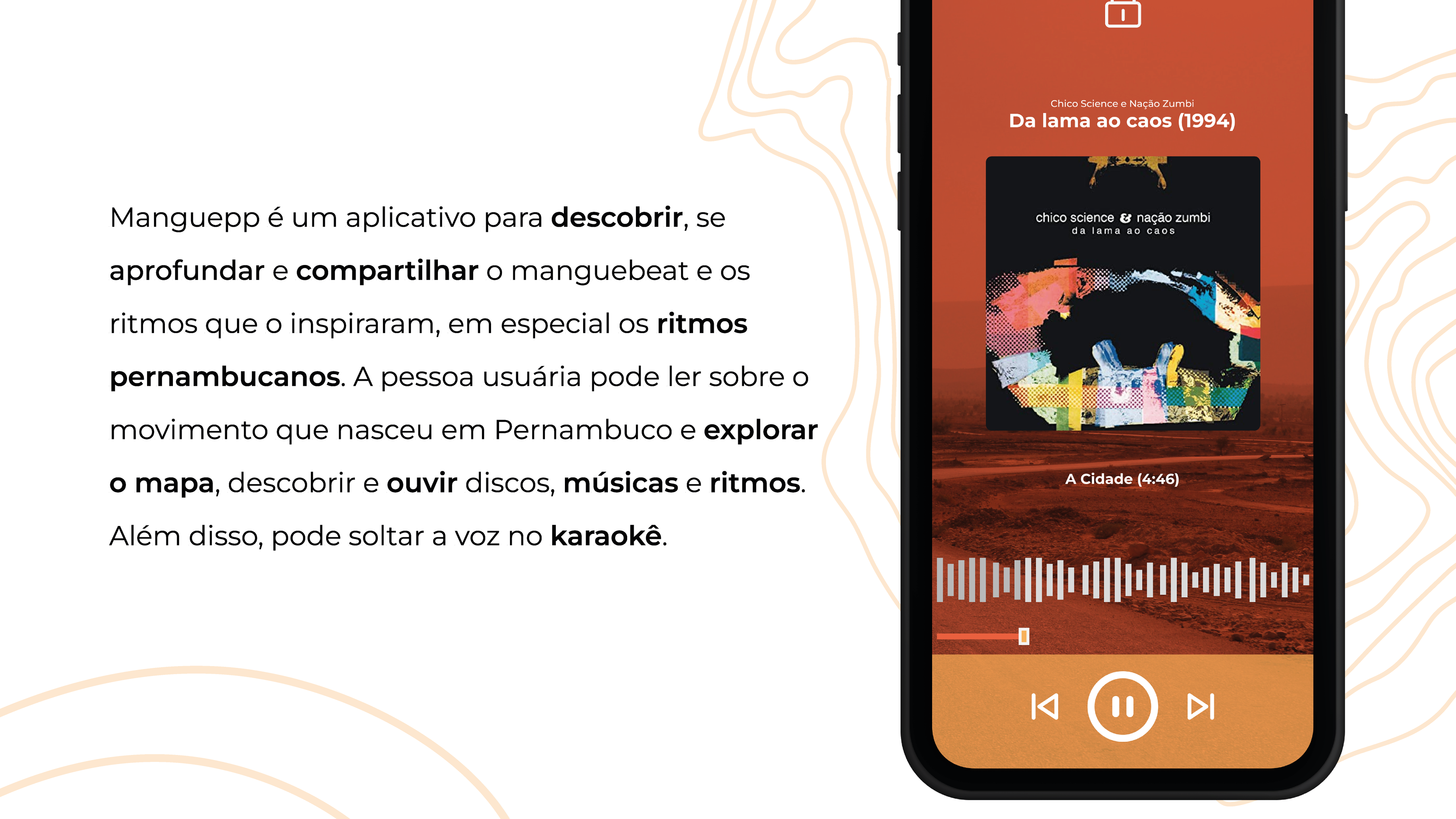 Trabalho iniciado durante a disciplina de Design de Interfaces e ajustado como projeto de conclusão de curso. Ele apresenta um aplicativo de música de um recorte muito importante da cultura pernambucana que é o Manguebeat. Através desse aplicativo, é possível conhecer a história dos álbuns, a história dos artistas, os ritmos relacionados em cada uma das músicas, assim como um karaokê.